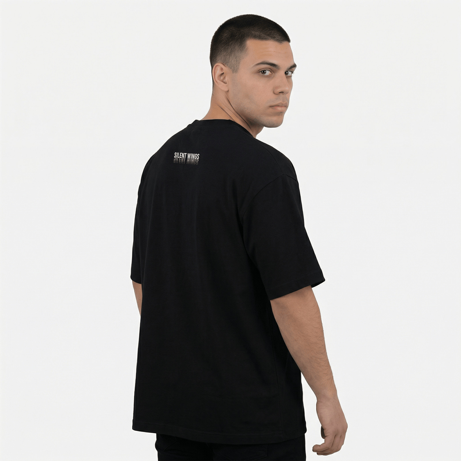 Más que una prenda, una declaración de intenciones. Nuestra camiseta oversize negra de la Colección P25 es la silueta esencial que te otorga libertad y confort, permitiéndote definir tu propio camino con una elegancia serena.